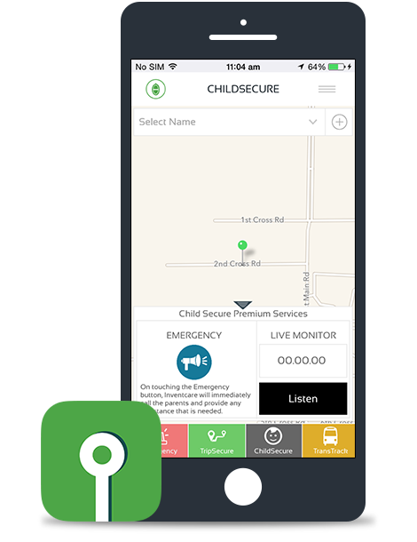 This feature keeps the parents connected to their children using the proprietary Inventcare tracker. The parents can see the exact location of the child at any given time through Inventcare. For Eg: In school, in tuition, in games, in movie theater, with baby sitter etc. The Child Secure app also has a unique LIVE monitor which when used allows the parent to hear the child for 10 seconds. The child also has the ability to press a red button in the device to notify the parent of any potential threat or discomfort so that the parent can take appropriate action. In the event, the child does not have the Inventcare Secure Tracker but has a smart Phone, the smart phone details can be added in Inventcare and the same feature can be used. This tracking feature will be enabled in Inventcare only when the child accepts the invitation for being tracked and protected through the Inventcare app. The child being secured and protected must also be a registered user of Inventcare.